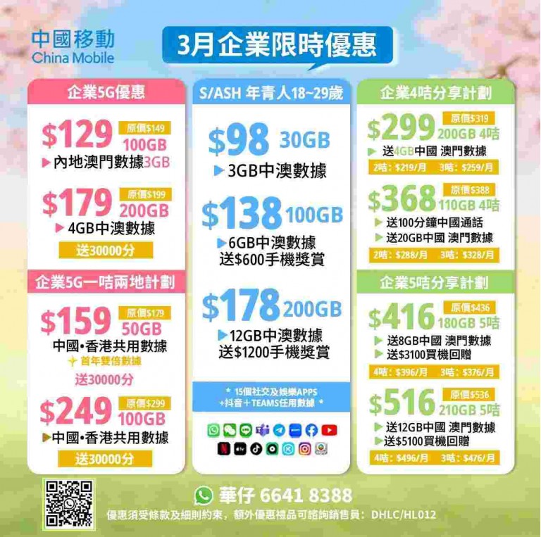 🟩於中國/澳門免費接聽來電及每月打出100分鐘