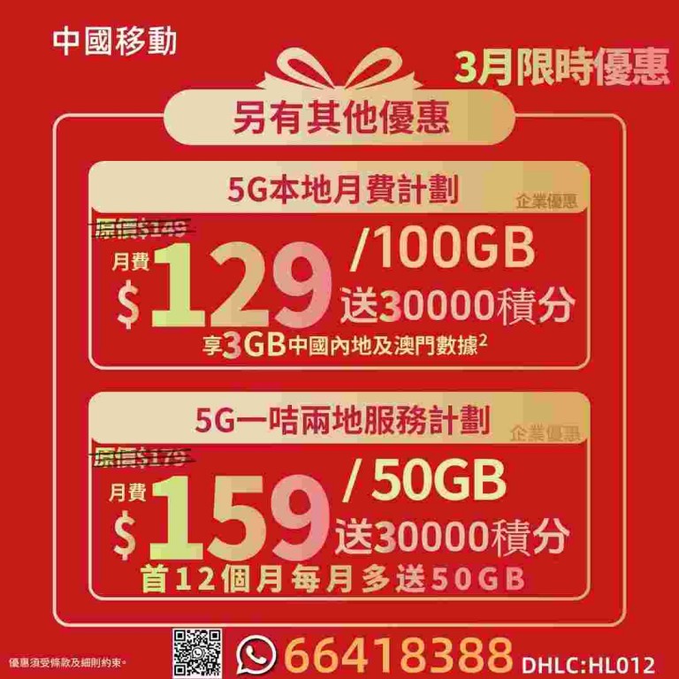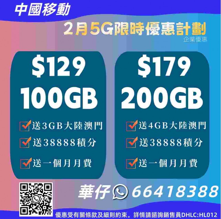 🎁中移動最新優/$129/100GB