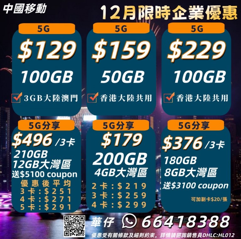 🔴5G全速100GB (中港數據)+(香港)其後不高于1MB任用
