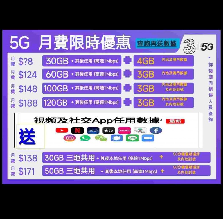 #手提電話 #轉台優惠 #5G #5G寬頻 #寬頻 #家居上網 #上網 #流動上網 #月費計劃 #手機上網 #3香港 #無限上網 #任用數據 #智能手機 #轉台 #月費優惠 #村屋上網 #商業寬頻 #鋪頭上網 #免安裝 #免拉線 #wifi #csl #hkt #smartone #3HK #sunmobile #pccw #cmhk #中國移動 #數碼通
